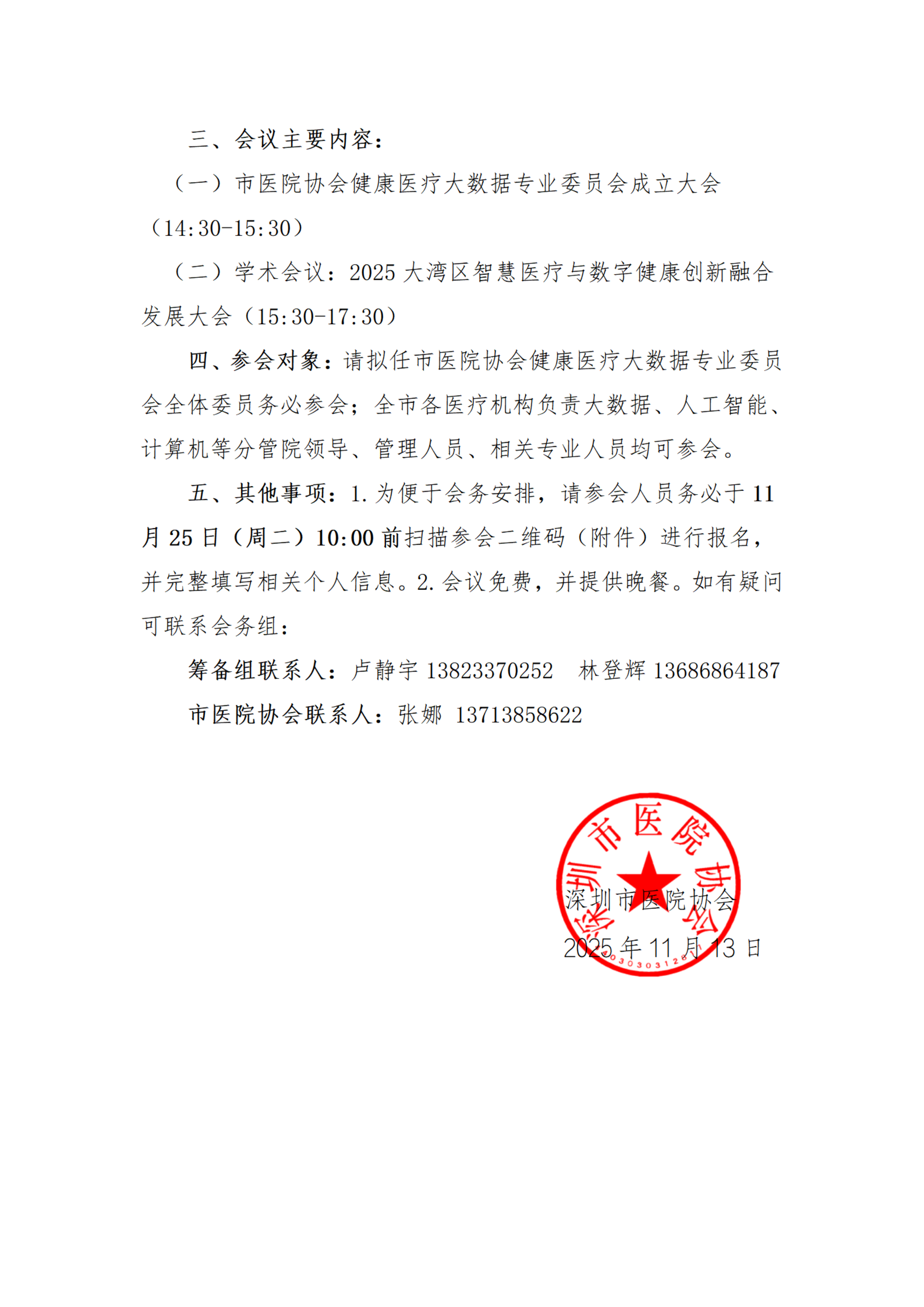 【分会通知】关于召开深圳市医院协会健康医疗大数据专业委员会成立大会暨2025大湾区智慧医疗与数字健康创新融合发展大会的通知