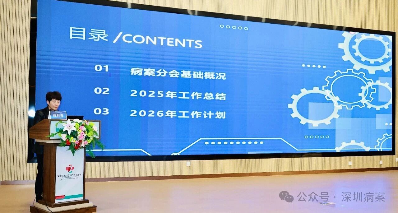 随后,深圳市医院协会病案分会会长陈彩霞就2025年度分会工作进行了系统总结。在回顾过去一年于病案管理、编码培训、质量控制等方面取得的进展时,特别提到分会在2024年度分支机构综合评定中,获评A+的优异成绩。这一成果是对过往工作的充分肯定,也为新一年的工作奠定了坚实基础。