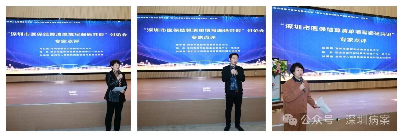 讨论会尾声,深圳市医院协会病案分会会长陈彩霞、深圳市医疗保险基金管理中心一级主办陈泉、深圳市人民医院病案管理科副主任技师林佩珊对汇报内容进行了点评,并就编码实践中遇到的共性难题提出指导建议。