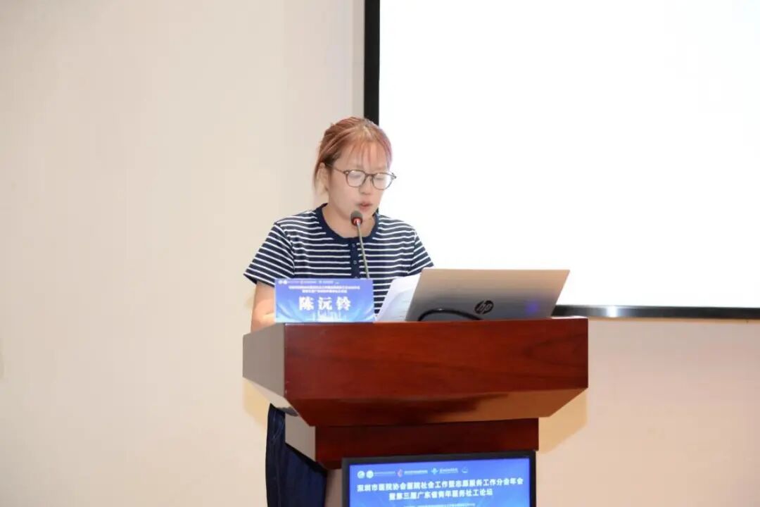 深圳市龙岗区春暖社工服务中心李检阅副总干事以《精准耦合,生态共建:医务社工资源整合升维》为题,阐述了医务社工从传统“资源搬运工”向“生态共建者”的角色转型。她强调,医务社工应成为连接医院与社会的“枢纽”,通过精准评估并“翻译”医患需求,实现资源的高效匹配与灵活转化。深圳市儿童医院社工部陈沅铃社工督导以《医务社工视角下的医疗救助:链接、管理与可持续发展》为分享主题,从微观、中观和宏观三个维度,详细介绍了深圳市儿童医院医务社工在医疗救助领域的系统化实践经验。