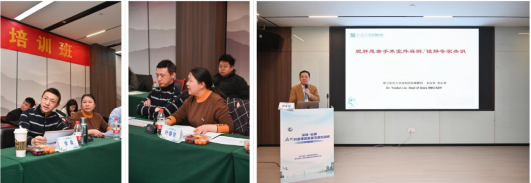 第二环节,在黄山市人民医院叶春芳教授和中国医学科学院肿瘤医院深圳医院李泉教授的主持下,南方医科大学深圳医院刘友坦教授为大家做《肥胖患者手术室外麻醉/镇静临床专家共识解读》报告。在报告中刘教授深入解读专家共识,强调肥胖患者应进行全面的术前评估与准备,并推荐使用对呼吸抑制影响小的新型镇静药物。同时明确指出甲苯磺酸瑞马唑仑相较于丙泊酚,具有呼吸抑制轻、起效失效快、体内无蓄积等优点,更适合肥胖患者的麻醉镇静,为临床提供了更安全、可控的用药选择。