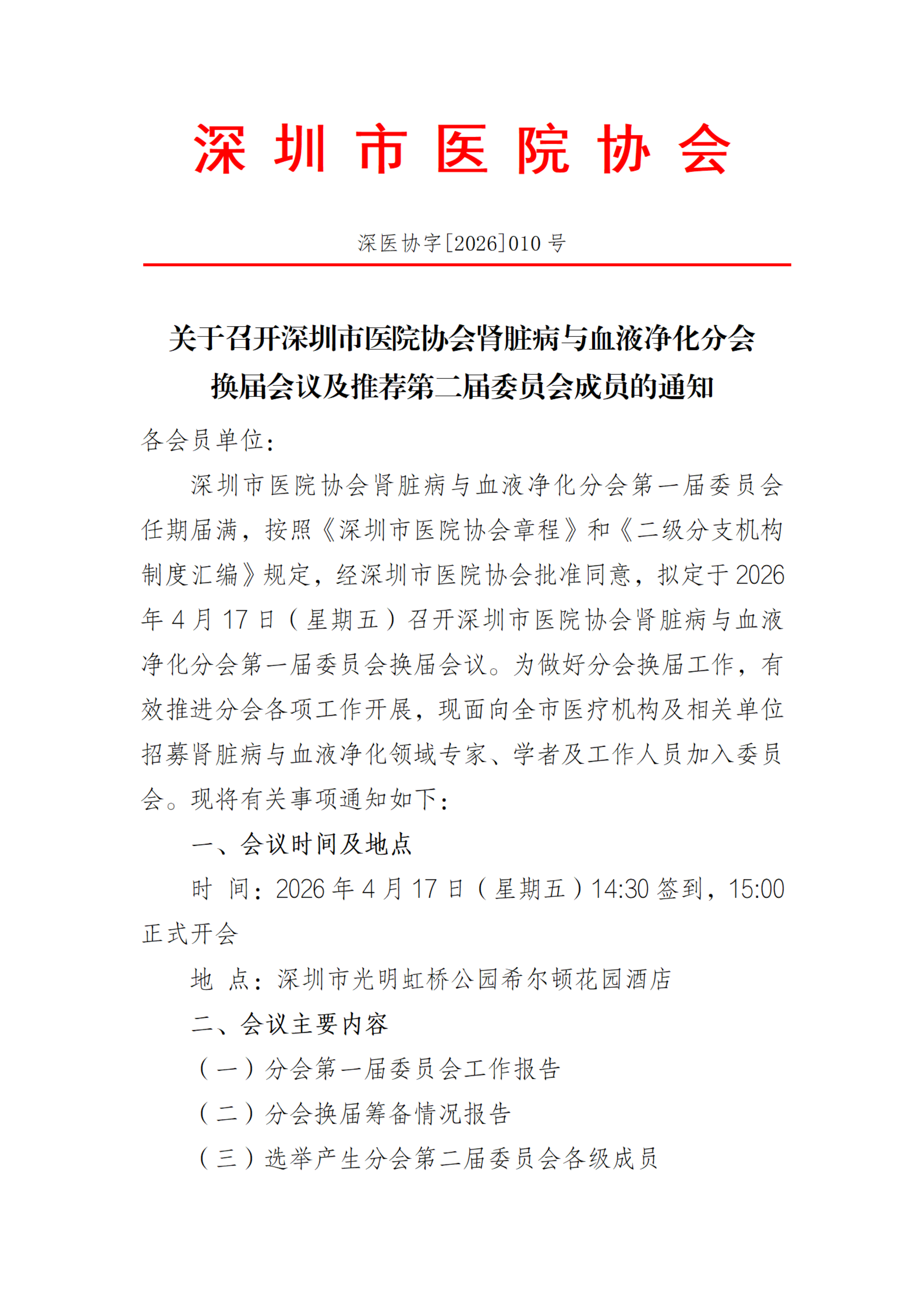 【分会通知】关于召开深圳市医院协会肾脏病与血液净化分会换届会议及推荐第二届委员会成员的通知