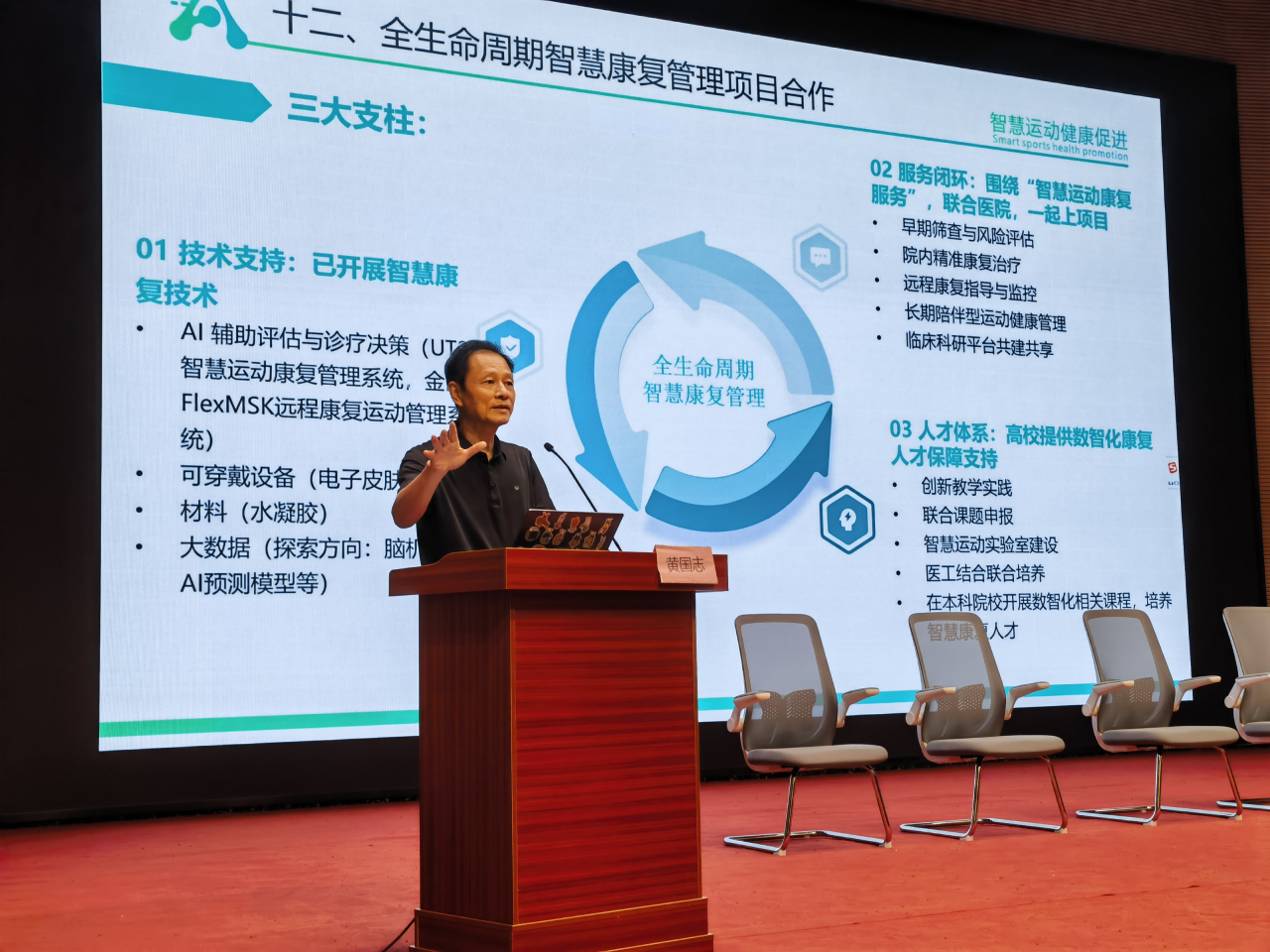 在主持人陈桂英主任和许明珠教授的主持下,黄国志教授以《智慧康复医学学科发展创新思路探索与实践》为题,分享了其在智慧康复医院构建的整体方案设计及跨界资源整合方面的实践经验,强调“全生命周期智慧运动康复”理念。
