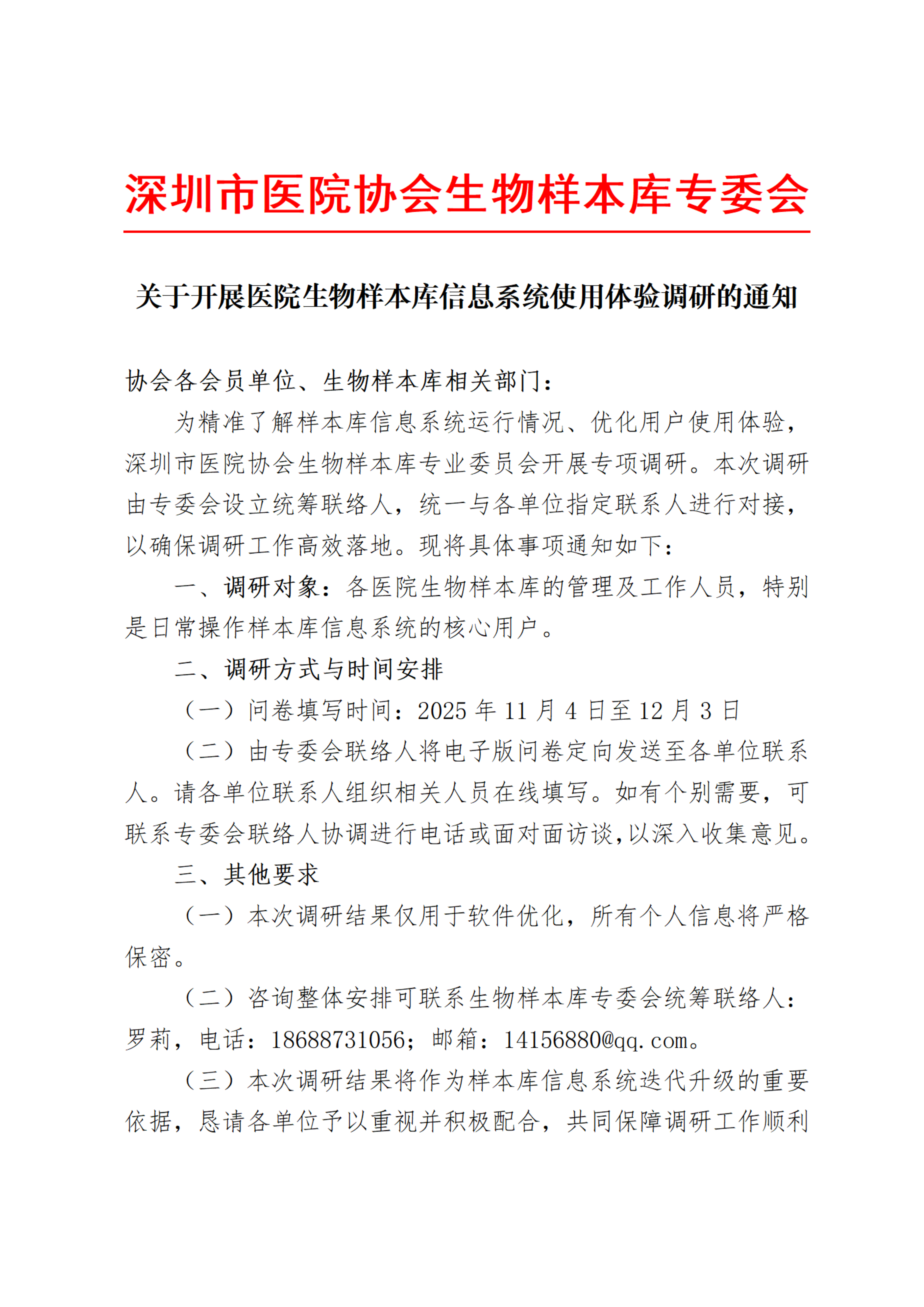 【分会通知】关于开展医院生物样本库系统使用体验调研的通知