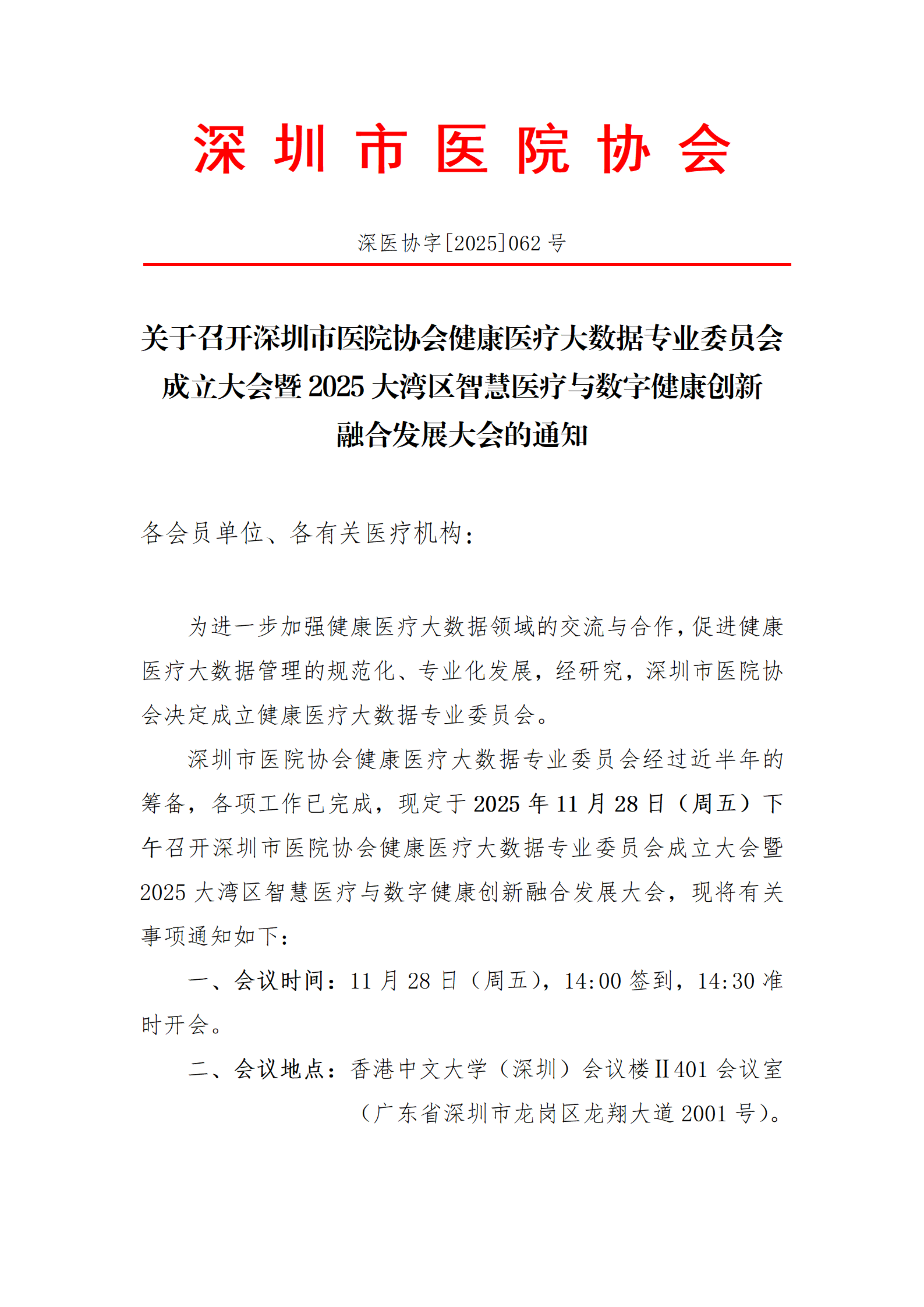 【分会通知】关于召开深圳市医院协会健康医疗大数据专业委员会成立大会暨2025大湾区智慧医疗与数字健康创新融合发展大会的通知