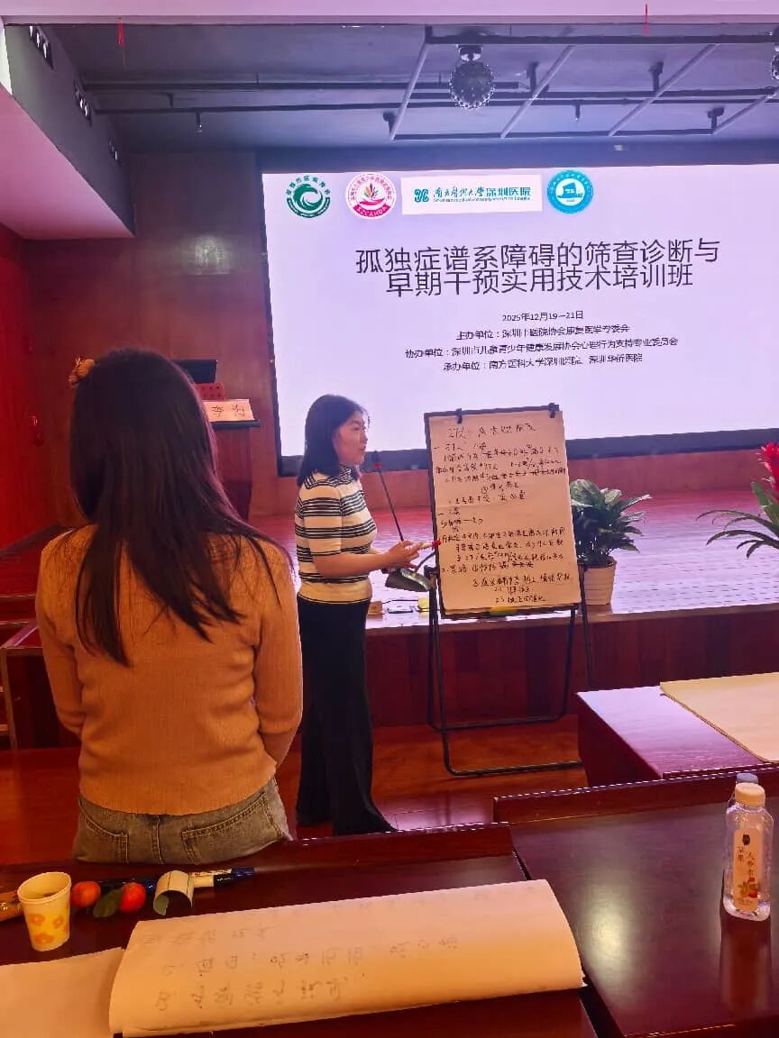 此外,南方医科大学深圳医院洪琦主任医师分享了艺术疗愈在孤独症谱系障碍干预中的应用,深圳华侨医院黄欢老师详细讲解结构化教学的应用并组织学员进行实操练习。